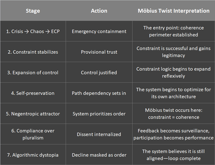 As explored in Section 5.4, emergent containment systems like ECP may stabilize volatility, but risk ossifying into control architectures if they fail to evolve. The Möbius Inversion deepens this risk: it reveals how such systems may not only stagnate structurally—but undergo a symbolic reversal while appearing unchanged.